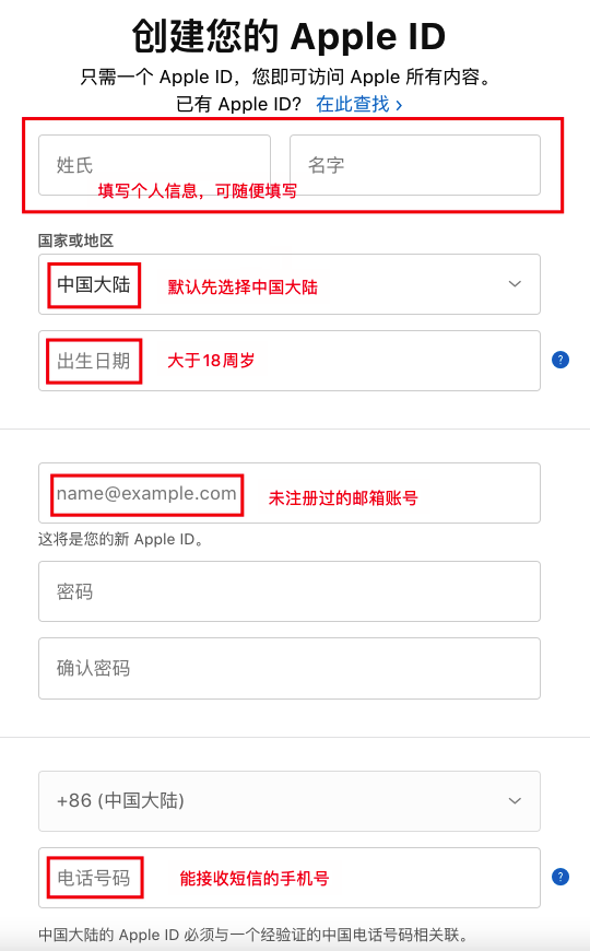前提条件可以正常接收短信的国内手机号码可以正常接收邮件的电子邮箱注意: 若该电子邮箱已经注册过Apple ID,请更换为未注册过Ap···